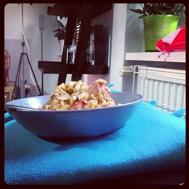 Curry scrambled eggs and mushroom wurst