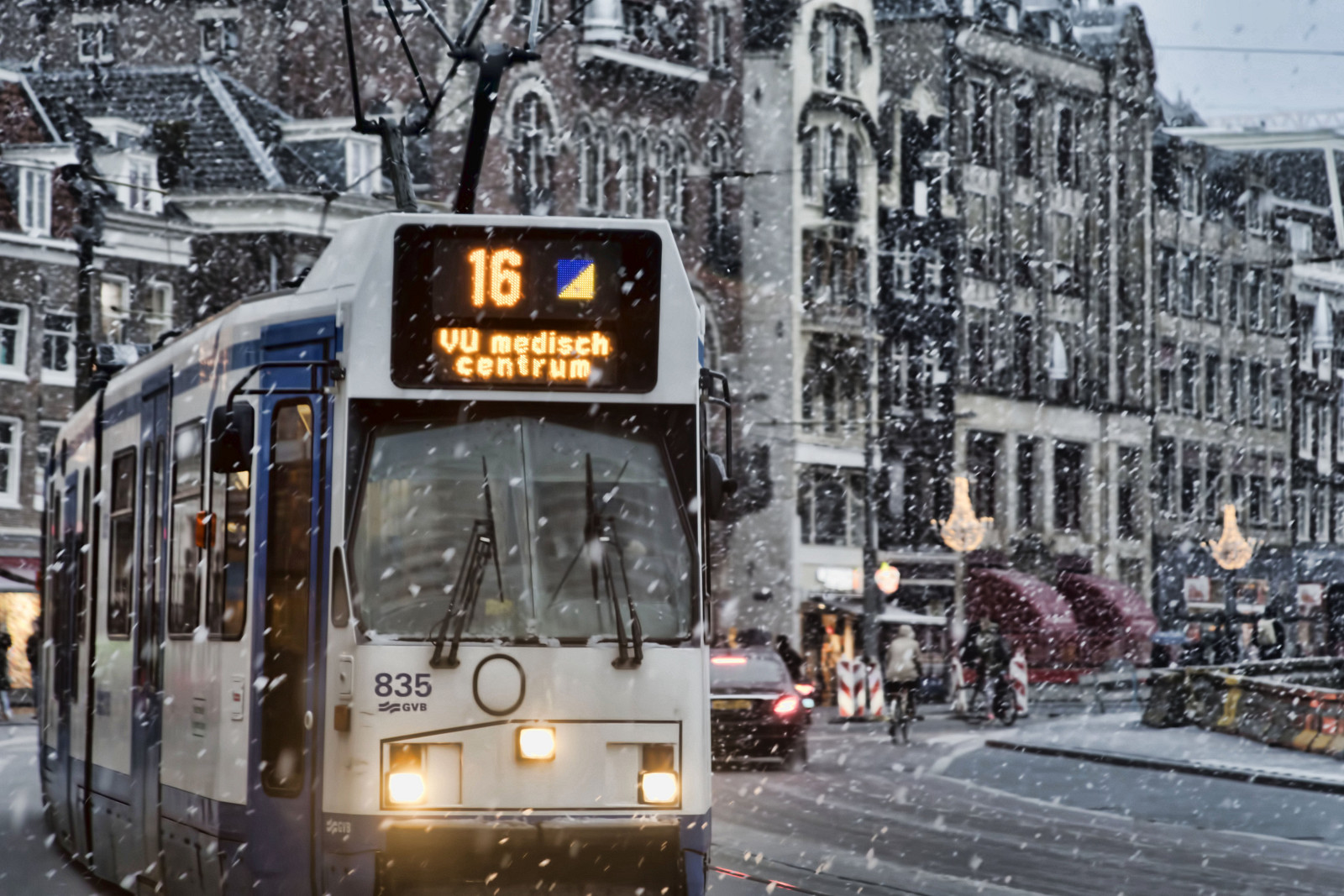 Tram drives through a sudden snowstorm on Amsterdam’s famous Rokin.